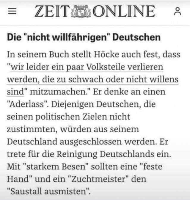 Mir ist dagegen am Grünen Infostand bereits wörtlich angedroht worden, mich verschwinden zu lassen, wenn sie erst dran seien. Ich bin dann wohl einer von den auszumistenden Deutschen, die aus Höckes Deutschland ausgeschlossen werden sollen.