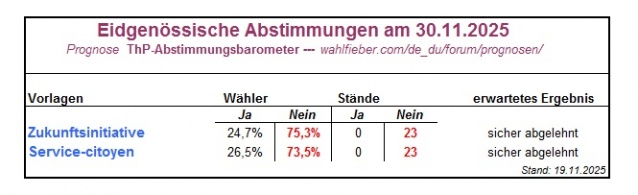 Einzelheiten incl. der Prognosen für die Abstimmungen am 30.11.2025 findet ihr hier: