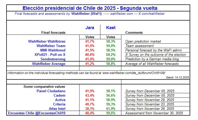 Da in Chile keine weiteren Umfragen veröffentlicht werden (in den letzten 14 Tagen vor der Wahl herrscht diesbezüglich Funkstille), hier schon einmal die aktuell vorliegenden 16 Einschätzungen - Stand: 09.11.2025 - ...