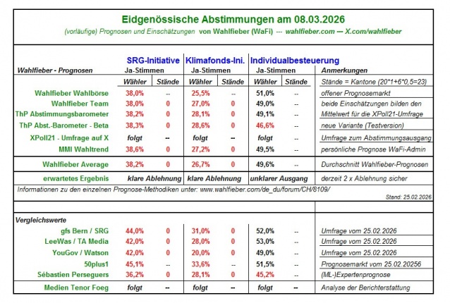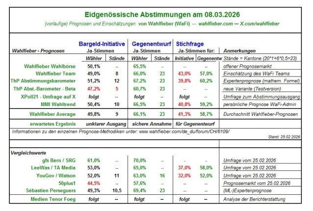 "In der Schweiz finden am 08.03.2026 mehrere Eidgenössische Volksabstimmungen statt. Konkret soll das Wahlvolk abstimmen über folgende Vorlagen: die SRG-Initiative, die Klimafonds-Initiative, das Bundesgesetz zur Individualbesteuerung sowie die Bargeld-Initiative und deren direkter Gegenentwurf. Bzgl. der Bargeld-Initiative findet zudem eine Stichfrage statt, falls beide Vorlagen angenommen werden sollten. - Kannst du mir konkret benennen, wie viele Ja-Stimmen in Prozent die einzelnen Abstimmungen vermutlich erhalten werden und wie die bereits genannte Stichfrage in Prozenten ausgehen könnte? Mir ist dabei wichtig, konkrete Prozentzahlen zu erhalten. - Berücksichtige bei deiner Analyse bitte nicht alleine die Umfrageinstitute (gfs Bern, Leewas, YouGov), sondern auch weitere Prognosen und Einschätzungen alternativer Anbieter und Institute - z.B. Wahlfieber (incl. Wahlfieber Average, Wahlfieber Wahlbörsen, Wahlfieber Team), 50plus1, XPoll21 – Umfragen auf X, Sebastien Perseguers, Gradiom.ch, MMI-Wahltrend, ThP-Abstimmungsbarometer, foeg-Abstimmungsmonitor, Matthias Bürcher, CH-Polit-X sowie weitere Prognostiker."