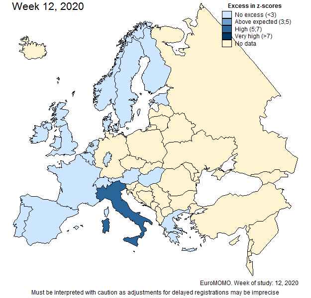 Was genau soll uns die mit Ausnahme von Italien wenig aufsehenerregende Sterblichkeit in Kalenderwoche 12 sagen? Dass die Opferzahlen damals in den meisten europäischen Ländern noch sehr niedrig waren, ist jetzt keine weltbewegende Neuigkeit. Die Frage ist doch eher, wie die Karte in KW 16 oder 20 aussieht...