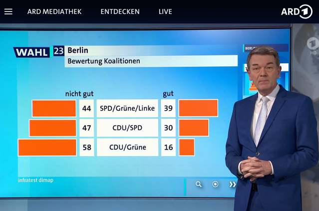 Und viele enttäuschte SPD-Wähler seien ja zur CDU gewandert. Ich würde CDU-SPD-Koalition vermuten, falls Grüne vor der SPD landen.