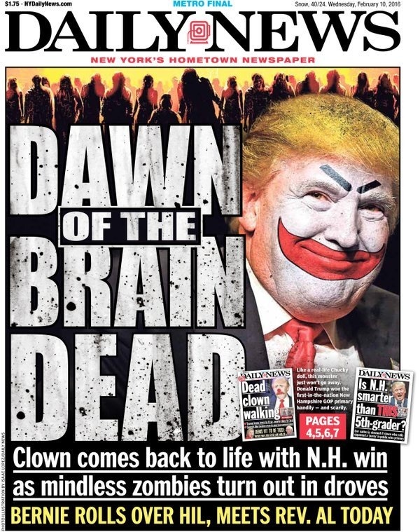 Die Zeitung springt allerdings auch mit dem Local Hero Drumpf nicht zimperlicher um; hier die erste Seite nach dessen Sieg in New Hampshire: