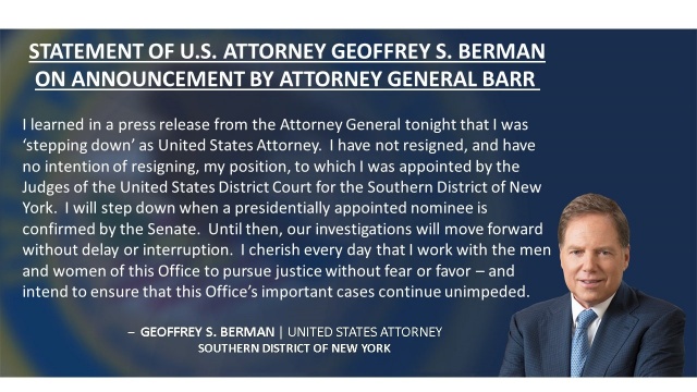 Drumpf hat bereits einen Generalstaatsanwalt für den südlichen Teil New Yorks (also auch New York City) feuern lassen, seinem Nachfolger soll nun das Gleiche widerfahren. Der Justizminister verkündet dessen Rücktritt, der Betroffene weigert sich zu gehen. Das könnte auch noch hässlich werden.